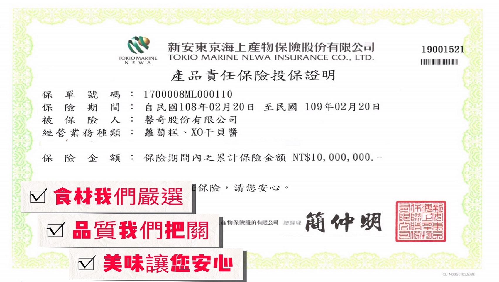 負責保證: 投保1000萬產品責任險, 表示對品質的堅持和負責態度。