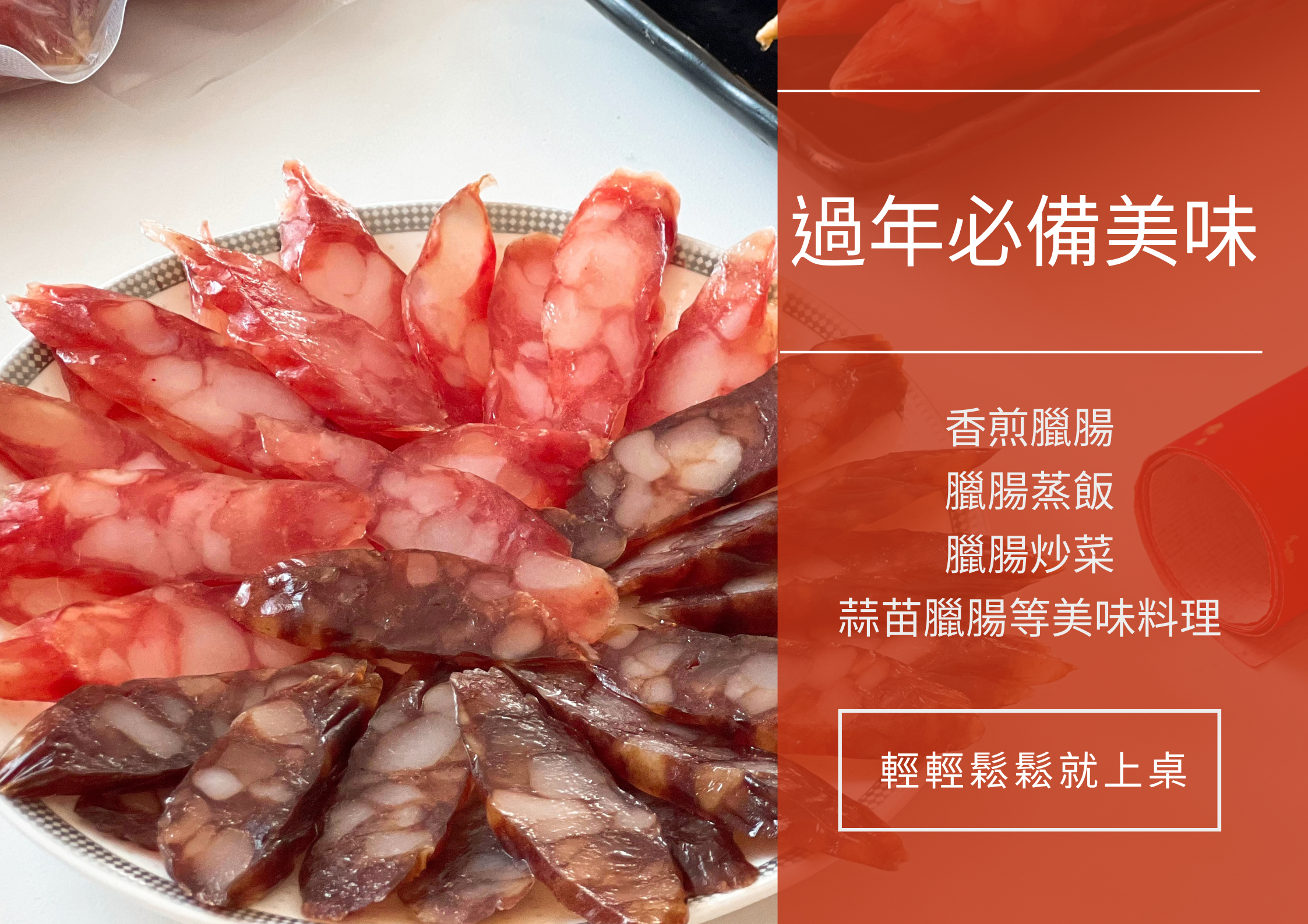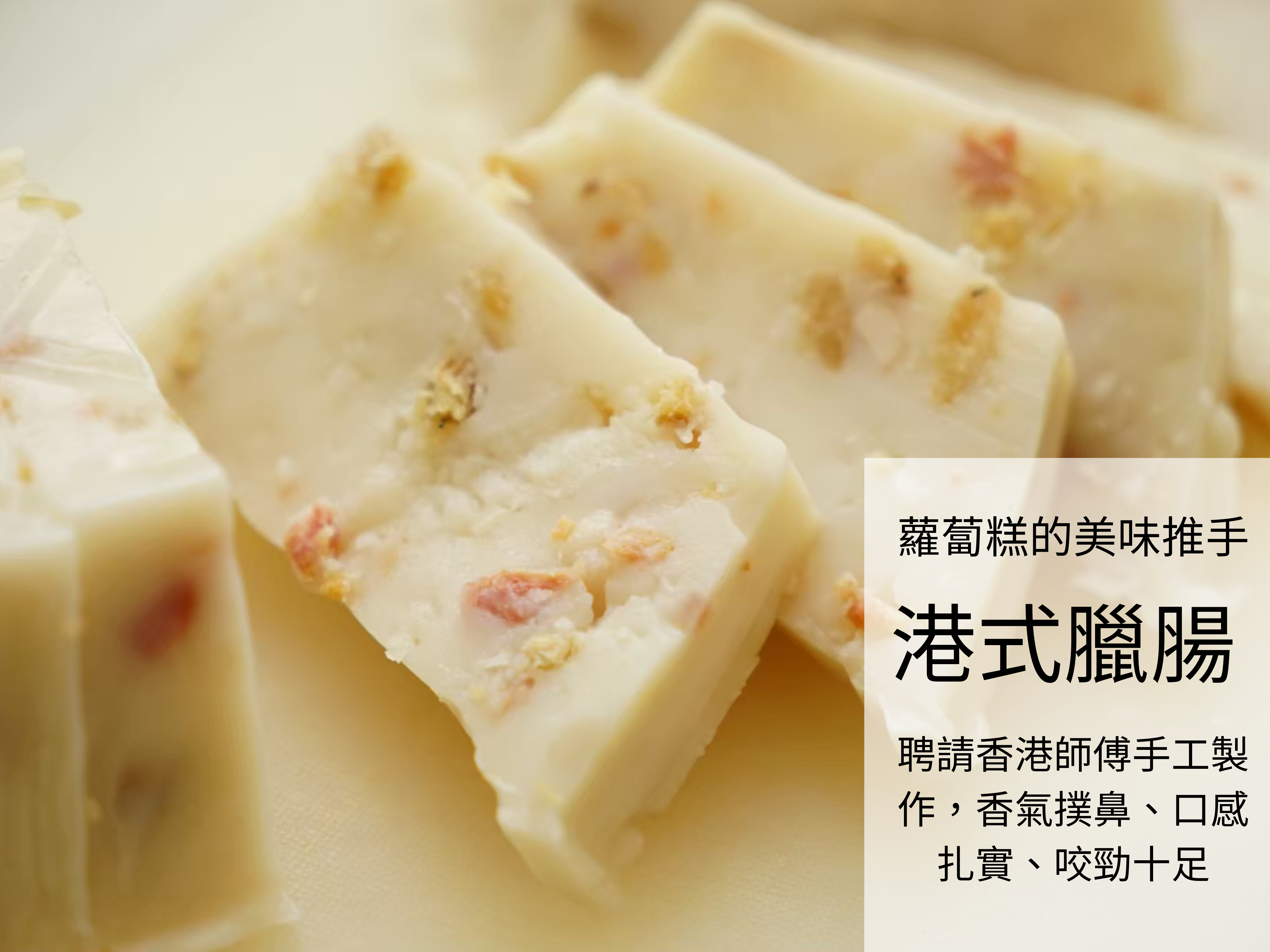 港式蘿蔔糕的靈魂,就是香港師傅手工製作的「臘腸」,香氣撲鼻、口感扎實、咬勁十足!臘腸是年節應景佳餚,也是送給親友長輩最喜氣又受歡迎的禮盒!